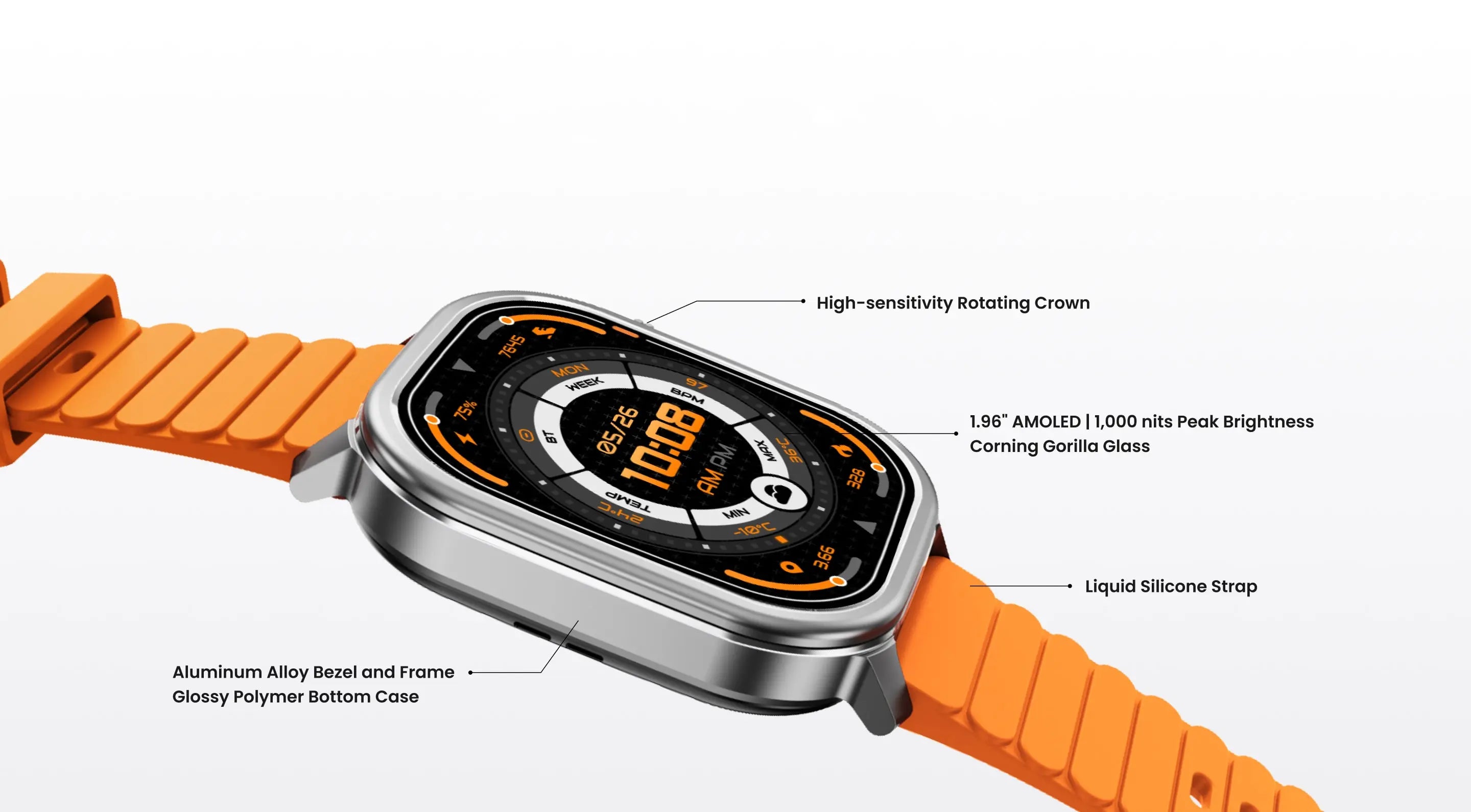- 1.96" Layar dengan Sentuhan Intuitif dan Mahkota Berputar.