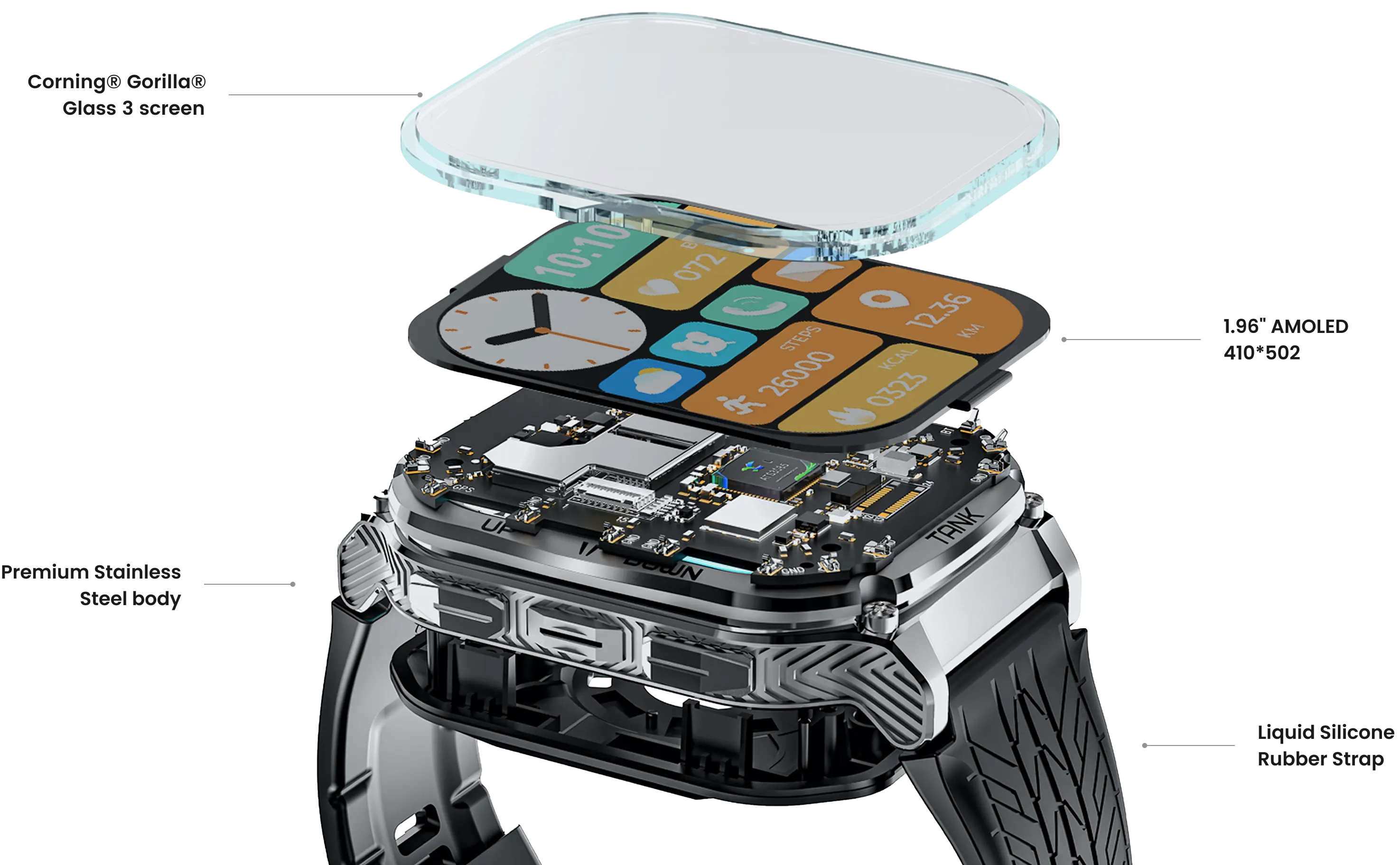 Thanks to its 1.96-inch HD always-on AMOLED display, the largest display yet applied to a KOSPET smartwatch, KOSPET TNAK M3 features ultra-clear visibility in any environment, with a peak brightness of 1,000 nits in intense outdoor light.