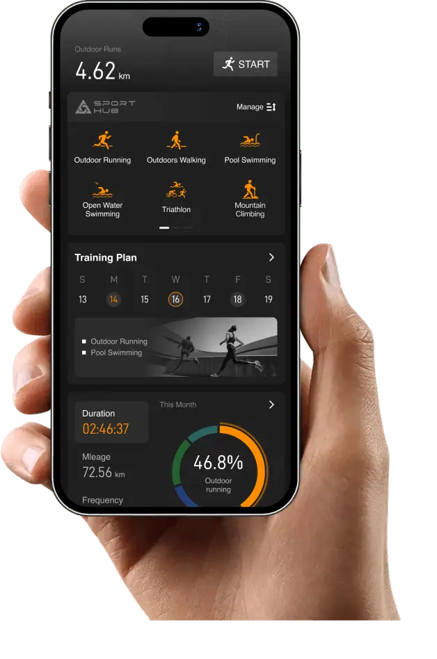 Take charge of your training and health data through the dedicated app. Create custom workouts, monitor your stats, and get smart insights, all seamlessly integrated with your watch.